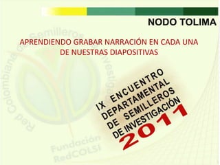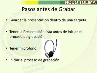 Este documento proporciona instrucciones para grabar narraciones en diapositivas de PowerPoint. Primero, se debe guardar la presentación en una carpeta y tenerla lista antes de grabar, así como un micrófono conectado. Luego, en la diapositiva que se desea grabar, se debe ir al menú Presentación con diapositivas, seleccionar Grabar narración y hacer clic en Aceptar. Finalmente, se graba hablado por el micrófono y al terminar se presiona ESC y se guarda la grabación.