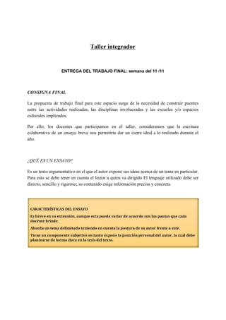 El documento detalla las pautas y la estructura para la elaboración de un ensayo colaborativo entre docentes sobre la educación intercultural, enfatizando la escritura argumentativa, la inclusión de testimonios y la valoración de la cultura mapuche. Se presentan ejemplos de los temas que deben ser abordados, como el rol de la mujer mapuche y las diferencias en la celebración de efemérides en la educación intercultural bilingüe. Se subraya la importancia de la creatividad en el título y el correcto uso de citas y recursos argumentativos en el ensayo final.
