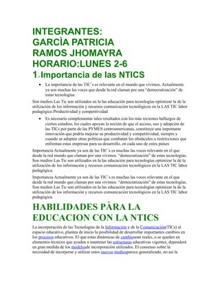 El documento habla sobre el uso de las TIC en la educación. Menciona que las TIC son importantes para optimizar la utilización de recursos tecnológicos en la labor pedagógica y mejorar la productividad y competitividad. También señala algunas contradicciones en el sistema educativo respecto al uso de las TIC, como que se promueve su uso en el aula pero se prohíben cosas como los celulares. Además, analiza el impacto que han tenido las nuevas tecnologías en la sociedad.