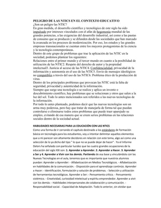El documento discute la importancia de las tecnologías de la información y la comunicación (TIC) en la educación. Indica que las TIC brindan a los estudiantes la capacidad de aprender de forma autónoma y aplicar conocimientos en diferentes contextos, además de aumentar el nivel científico. También expone los usos sociales potenciales de las TIC y cómo la educación puede promover una cultura digital saludable mediante el desarrollo de habilidades con las TIC.