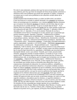 El documento describe la importancia de las tecnologías de la información y la comunicación (TIC) en la educación. Explica que las TIC brindan a los estudiantes la capacidad de aprender de forma autónoma y aplicar conocimientos en diferentes contextos. También expone algunos desafíos del uso de las TIC, como la brecha digital y problemas éticos. Finalmente, señala que es necesario que los estudiantes desarrollen habilidades como la alfabetización digital, el pensamiento crítico y la colaboración para aprovechar plen
