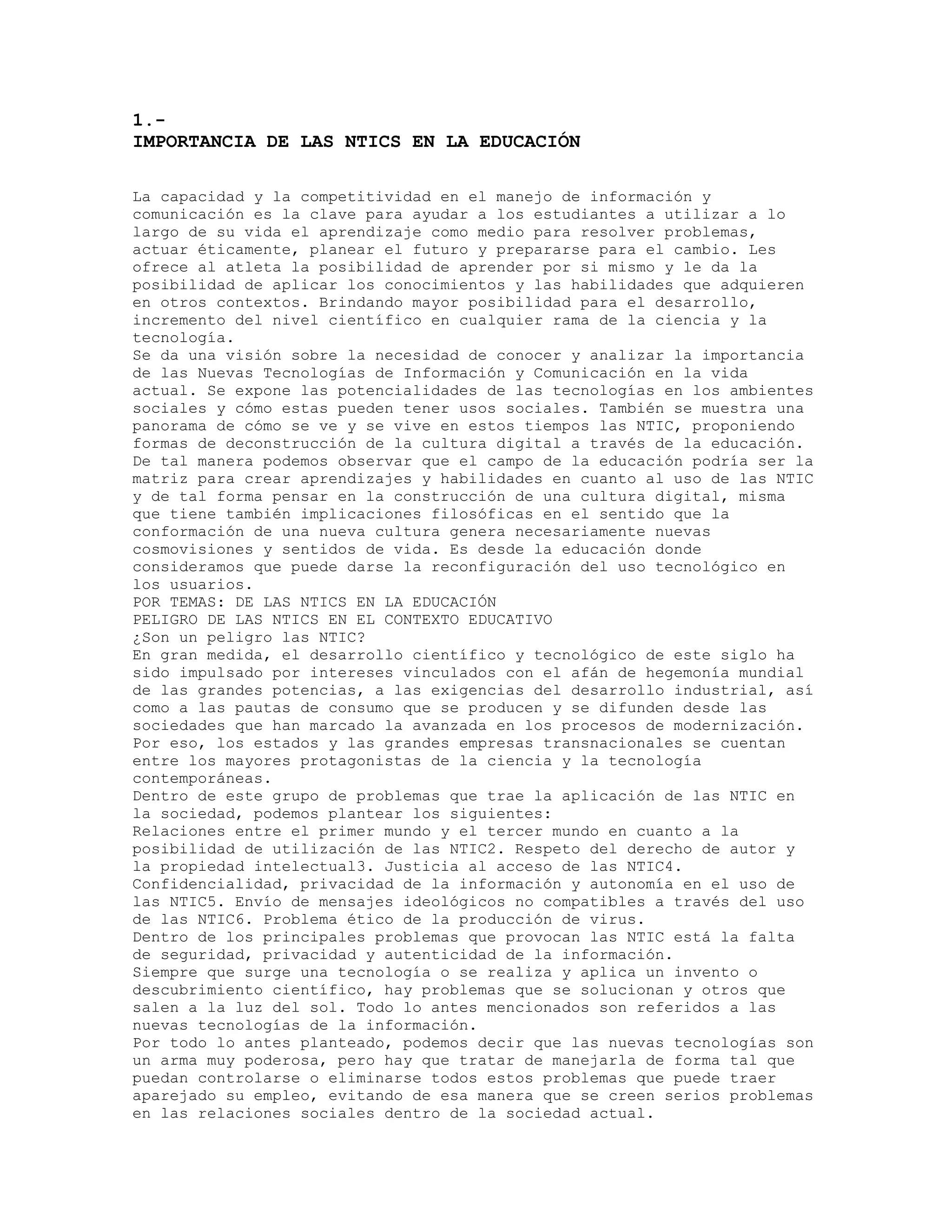 1. El documento destaca la importancia de las tecnologías de la información y la comunicación (TIC) en la educación para ayudar a los estudiantes a aprender, resolver problemas y prepararse para el cambio. 2. Señala algunos de los desafíos y peligros potenciales de las TIC, como la falta de seguridad y privacidad de la información. 3. Argumenta que si bien las TIC son poderosas, deben usarse de manera responsable y controlada para evitar problemas en las relaciones sociales.