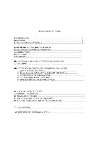 Este documento resume la relación entre la inteligencia emocional y la filosofía para niños. Explica que la filosofía para niños ayuda a desarrollar las cinco habilidades de la inteligencia emocional identificadas por Goleman a través de la comunidad de indagación, el pensamiento cuidadoso y el desarrollo de habilidades emocionales. Además, analiza las emociones desde la perspectiva de filósofos como Aristóteles, Zagzebski y Nussbaum para entender mejor su naturaleza y