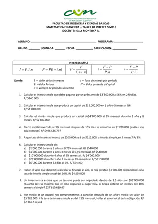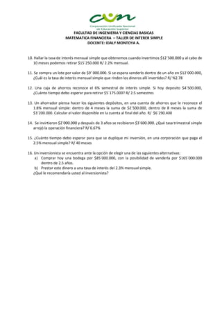 Este documento presenta 16 ejercicios de cálculo de interés simple con diferentes tasas de interés y períodos de tiempo. Los ejercicios involucran calcular el interés, el capital inicial, el valor futuro y la tasa de interés en diferentes escenarios financieros como préstamos, inversiones y depósitos bancarios.