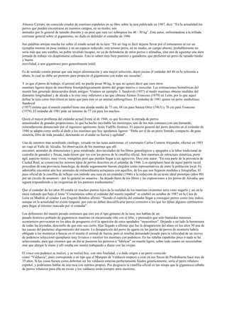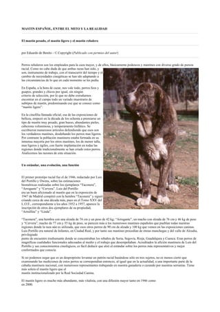 El documento discute las diferencias entre el mastín ligero español tradicional y el mastín más pesado promovido por los clubes caninos en las décadas recientes. Argumenta que el mastín ligero ha sido la forma predominante y más funcional de la raza, adaptada para trabajar con el ganado y cazar en las diversas regiones de España. El estándar original de 1946 se basó en perros de la región de Ciudad Real y describía al mastín ligero, no al mastín más pesado favorecido hoy en día.