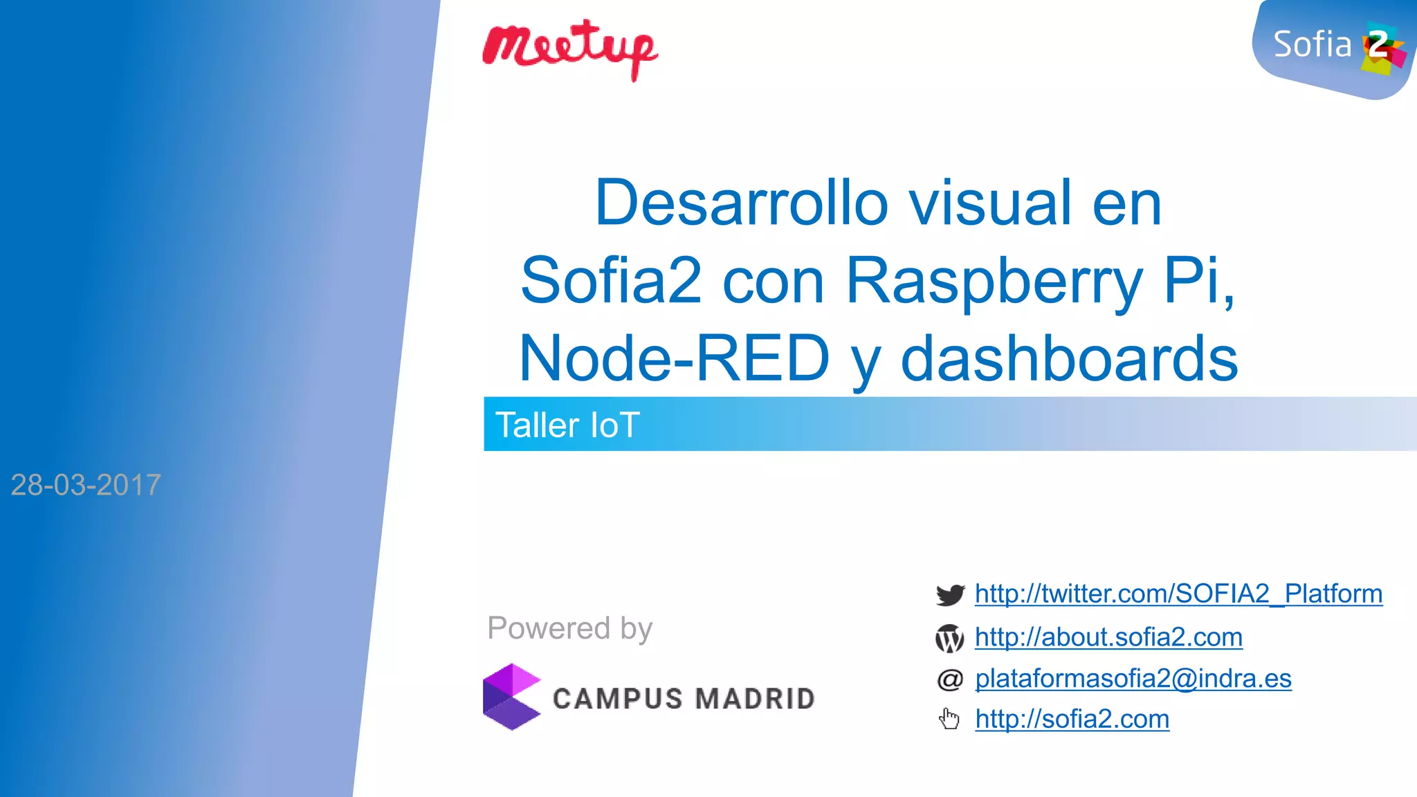 El documento presenta un taller sobre desarrollo visual de aplicaciones IoT con Raspberry Pi, Node-RED y dashboards en la plataforma Sofia2, el cual incluye componentes de arquitectura IoT, demostraciones y un taller práctico para construir flujos que sensorizan datos y los muestran en un dashboard.