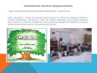 Este documento describe el enfoque de "lenguaje integral" para la enseñanza del lenguaje. Se enfatiza que el lenguaje debe enseñarse de manera integral y contextualizada, no fragmentada, para que sea significativo. Los niños aprenden el lenguaje de forma natural a través de experiencias auténticas como cuentos. El documento también proporciona actividades que los padres pueden realizar en casa para estimular el desarrollo del lenguaje en los niños.