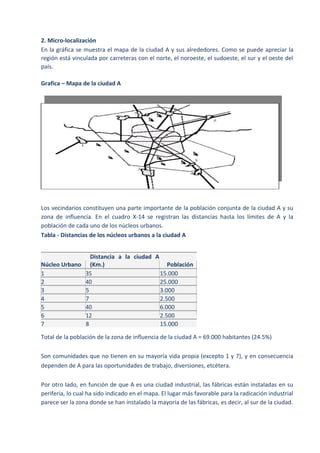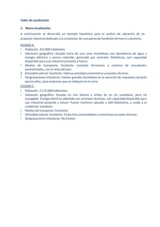 El documento analiza la ubicación óptima para una nueva planta de fundición entre dos ciudades. Describe los factores considerados en la macro y micro-localización, incluyendo población, transporte, costos, disponibilidad de recursos y accesibilidad. Al evaluar estos factores para las zonas norte y sur de la Ciudad A, determina que la Localidad 3 tiene la mejor ubicación debido a su proximidad a la ciudad, características del suelo, impacto ambiental y accesibilidad del personal.