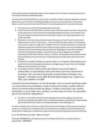 1. El documento describe cómo crear, ejecutar, eliminar y asignar macros en Excel, así como su relación con Visual Basic. 2. Visual Basic es un lenguaje de programación que se usa para escribir código VBA que controla las macros de Excel. 3. Las funciones como SI, SI anidada, PROMEDIO, CONTARSI, MAX y MIN se utilizan comúnmente en macros de Excel.
