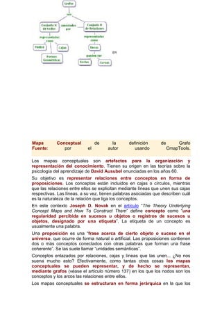 El documento presenta información sobre los mapas conceptuales. Explica que los mapas conceptuales son herramientas para representar el conocimiento de manera sencilla mediante conceptos y relaciones entre ellos. Los conceptos se representan en cajas y las relaciones entre conceptos se muestran con líneas. El documento también proporciona instrucciones para que los estudiantes construyan un mapa conceptual sobre diferentes tipos de lenguaje.
