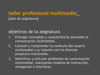 Este documento presenta los objetivos y temas de un taller profesional de multimedia. Los objetivos incluyen entregar conceptos de comunicación multimedial, conocer el comportamiento del usuario multimedial y su relación con proyectos, e identificar problemas de comunicación manejando modelos de interacción. Los temas cubren disciplinas como diseño de interacción, arquitectura de información y lenguajes de programación. También explora la función del diseñador multimedial como mediador entre personas, textos y contextos, y la relación entre el usuario, la tecnología y