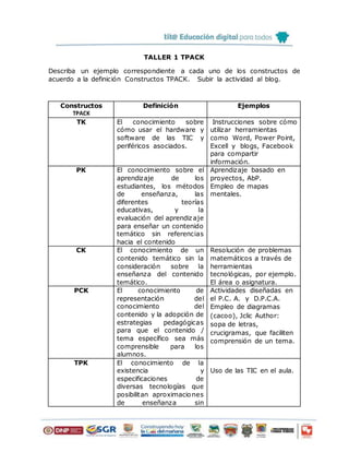 El documento describe los siete constructos del marco TPACK (Conocimiento Tecnológico Pedagógico del Contenido) y proporciona ejemplos de cada uno. Los constructos son: conocimiento tecnológico (TK), conocimiento pedagógico (PK), conocimiento del contenido (CK), conocimiento pedagógico del contenido (PCK), conocimiento tecnológico pedagógico (TPK), conocimiento tecnológico del contenido (TCK) y conocimiento tecnológico pedagógico del contenido (
