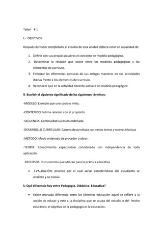 Este documento presenta una serie de preguntas y conceptos clave sobre diferentes modelos pedagógicos como el tradicional, activo, por objetivos y constructivista. Explica los fundamentos, elementos del currículo y representantes de cada modelo. También compara y contrasta los enfoques filosóficos y psicológicos entre los modelos.