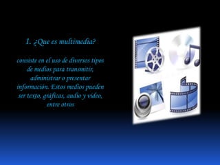 El documento habla sobre la multimedia y sus componentes. Define la multimedia como la combinación de diferentes medios como texto, gráficos, audio y video para transmitir información. Explica que puede ser lineal, interactiva o hipermedia dependiendo del nivel de control del usuario. También describe las ventajas de la multimedia y áreas como educación, negocios y el hogar donde se puede utilizar. Finalmente, detalla el hardware y software necesarios para crear contenido multimedia e incluye el ciclo de vida de desarrollo de sistemas.