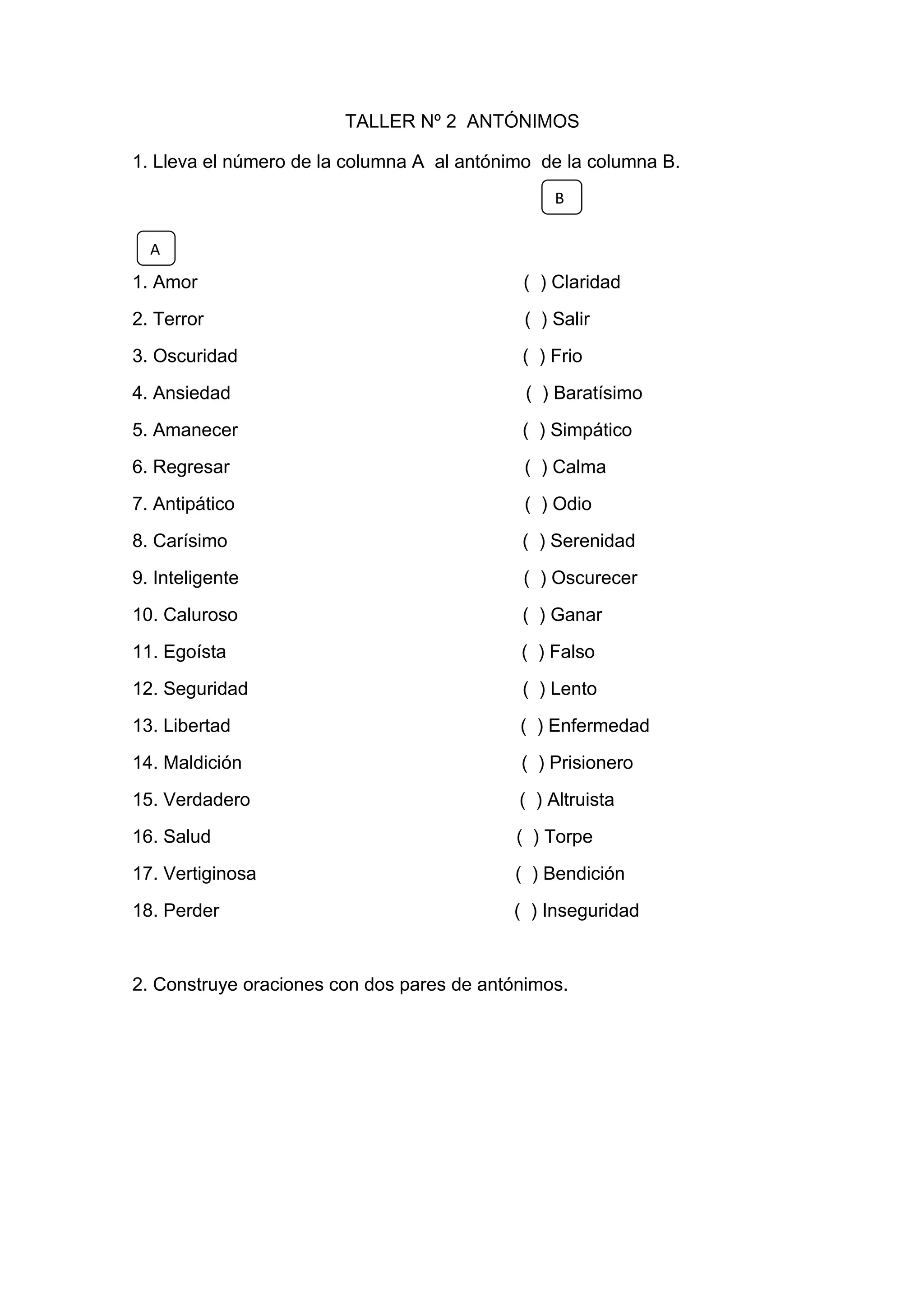 Este documento presenta una tabla con antónimos en las columnas A y B. Los estudiantes deben emparejar los términos en A con sus antónimos correspondientes en B. Luego se les pide que construyan oraciones utilizando dos pares de antónimos.