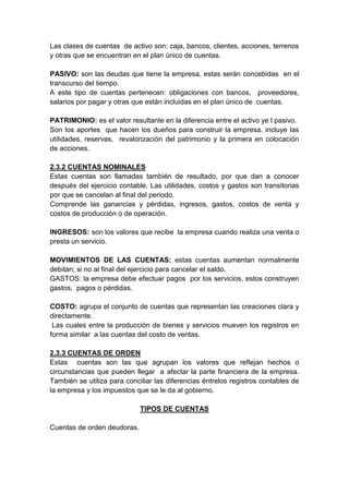 El documento presenta una explicación detallada de los conceptos básicos de contabilidad como la forma de la cuenta T, el débito, crédito y partida doble. Explica la clasificación de cuentas en reales, nominales y de orden, dando ejemplos de cada tipo. También describe los componentes del plan único de cuentas y cómo se codifican y clasifican las cuentas.