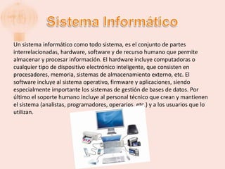 El documento presenta una introducción a los sistemas informáticos, describiendo que están compuestos de hardware, software y recursos humanos. Explica que el hardware incluye computadoras y dispositivos electrónicos, el software incluye sistemas operativos y aplicaciones, y el componente humano incluye personal técnico y usuarios. Luego describe gráficamente la estructura de un sistema informático genérico.