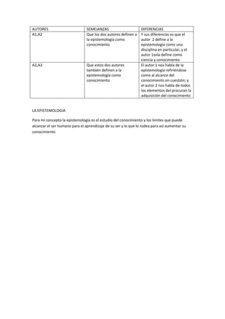 El documento resume tres definiciones de epistemología de acuerdo a tres fuentes. La primera fuente, Aristóteles, define epistemología como la ciencia o teoría de la ciencia. La segunda fuente se refiere a la epistemología como tener una mirada ecológica del conocimiento. Y la tercera fuente define epistemología como el estudio del conocimiento, sus fundamentos, límites y validez. El documento luego analiza las similitudes y diferencias entre las definiciones y concluye con la definición propia del autor, que es