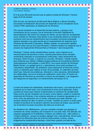 Windows 7 es la versión más reciente del sistema operativo Windows de Microsoft. Fue diseñado para mejorar la interfaz de usuario, incluir nuevas características y mejorar el rendimiento en comparación con versiones anteriores. Se lanzó oficialmente en octubre de 2009 y ha recibido actualizaciones como el Service Pack 1 para mejorar la estabilidad y el rendimiento.