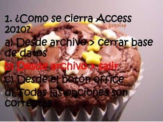 El documento proporciona información sobre cómo cerrar Access 2010 y utilizar las diferentes barras y herramientas del programa. Se puede cerrar Access 2010 desde el menú Archivo, pulsando ALT + F4, o cerrando la base de datos actual. La cinta de opciones contiene las herramientas organizadas en pestañas y grupos. La barra de estado muestra información contextual en la parte inferior. La ayuda y documentación están disponibles pulsando F1 o en el menú Archivo.