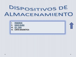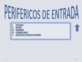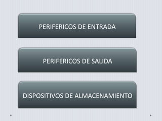 Este documento describe diferentes periféricos de entrada, salida y dispositivos de almacenamiento para computadoras. Entre los periféricos de entrada se mencionan el teclado, ratón, escáner y cámara web. Los dispositivos de salida incluyen el monitor e impresora. Los dispositivos de almacenamiento discutidos son el pendrive, disco duro, CD/DVD y cinta magnética.