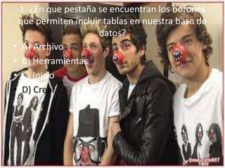 Este documento contiene 10 preguntas sobre cómo crear y definir tablas en una base de datos. Las preguntas cubren temas como dónde encontrar los botones para agregar tablas, cómo definir la estructura y campos mínimos requeridos, propiedades de campos, claves primarias y cómo cerrar una tabla.