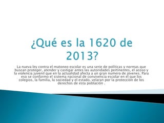 La ley 1620 de 2013 crea el sistema nacional de convivencia escolar para proteger a los estudiantes de la violencia y el acoso en las escuelas. El sistema involucra a las escuelas, familias, sociedad y estado para velar por los derechos de los estudiantes. También requiere la modificación de los manuales de convivencia de las escuelas y la creación de comités de convivencia escolar para tratar casos de acoso e intimidación de manera adecuada.