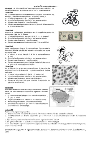 Este documento presenta 5 situaciones de variación lineal que involucran diferentes cantidades como la posición de un ciclista, el precio del dólar, el salario de un empleado, el crecimiento de una población de bacterias y la reducción de la selva amazónica. Para cada situación se pide calcular valores para diferentes tiempos/cantidades, organizarlos en tablas, graficarlos y encontrar expresiones matemáticas que relacionen las variables. También se piden conclusiones sobre las relaciones entre los valores en las tablas, los tipos de gráfic