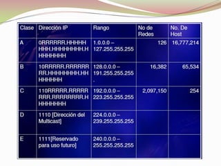 Una dirección IP identifica de manera lógica una interfaz de red dentro de una red que usa el protocolo IP. Existen diferentes clases de direcciones IP (A, B, C, D y E) y también direcciones privadas. La máscara de red delimita el ámbito de una red indicando qué parte de la dirección IP corresponde a la red y qué parte al host específico.