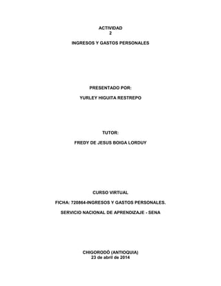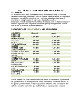 El documento presenta un ejercicio para desarrollar un presupuesto mensual personal que incluya ingresos y gastos. Se provee un ejemplo de tabla de presupuesto con categorías como ingresos dependientes, salario, otros ingresos, gastos fijos como arriendo y servicios públicos, gastos variables como ropa y entretenimiento. El objetivo es que el aprendiz complete la tabla con sus propios ingresos y gastos para evaluar si su presupuesto es suficiente o no.