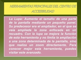 La lupa es una herramienta que permite ampliar parte de la pantalla para mejorar la visibilidad. Ofrece opciones como acercar, alejar o cambiar la vista. Permite configurar el porcentaje de zoom y el área que se enfocará al ampliar. Incluye modos como pantalla completa, lente o acoplado. Windows 7 incluye juegos preinstalados como Buscaminas, Solitario y ajedrez que se pueden encontrar en el menú Inicio o mediante búsqueda.