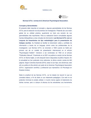 Este documento presenta un resumen de las Normas APA (American Psychological Association) para la redacción de documentos de investigación. Describe conceptos básicos como el lenguaje formal, los márgenes, la paginación, la presentación de cuadros, gráficos y referencias. El objetivo es facilitar la transmisión válida y confiable de información entre los profesionales de investigación siguiendo un formato estandarizado.