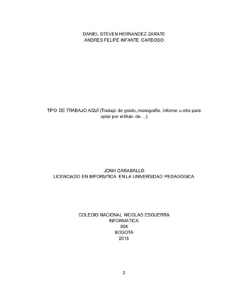 Este documento presenta un resumen de un trabajo de grado sobre bases de datos realizado por Daniel Steven Hernández Zarate y Andrés Felipe Infante Cardoso para el Colegio Nacional Nicolás Esguerra en Bogotá, Colombia en 2015. El trabajo incluye una introducción, objetivos, planteamiento del problema, marco teórico, materiales y metodología, desarrollo del proyecto, conclusiones, recomendaciones y bibliografía.