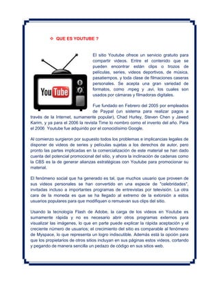 El documento proporciona información sobre YouTube y SlideShare. YouTube es un sitio web para compartir videos de forma gratuita, mientras que SlideShare es un servicio para compartir presentaciones en línea de manera similar a cómo YouTube comparte videos. Ambos sitios permiten a los usuarios publicar, ver y comentar contenido generado por otros.