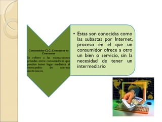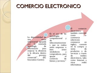 El documento resume el comercio electrónico, definiéndolo como cualquier transacción comercial entre partes que interactúan electrónicamente a través de redes como Internet para comprar, vender, distribuir e informarse sobre productos y servicios. Clasifica el comercio electrónico y discute sus ventajas y desventajas tanto para usuarios como empresas, concluyendo que es una metodología de negocios que usa intensamente redes de comunicación y sistemas de computación para reducir costos, mejorar calidad y acelerar distribución y flujos financ