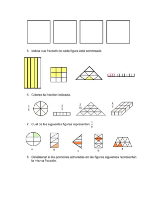 Este documento contiene 31 preguntas de evaluación sobre fracciones para estudiantes de séptimo grado. Las preguntas cubren una variedad de temas relacionados con fracciones como identificar fracciones equivalentes, comparar y ordenar fracciones, reducir a común denominador, calcular sumas y fracciones de cantidades, y resolver problemas de la vida real que involucran fracciones.