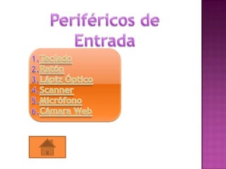 Este documento describe varios periféricos de entrada y salida para computadoras, así como dispositivos de almacenamiento. Entre los periféricos de entrada se incluyen el teclado, mouse, lápiz óptico y escáner. Los periféricos de salida mencionados son el monitor y la impresora. Los dispositivos de almacenamiento descritos son la memoria USB, disco duro, cinta magnética y disco compacto.