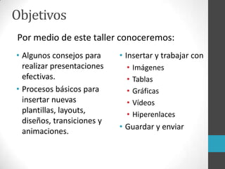 Este documento proporciona instrucciones para crear presentaciones efectivas en PowerPoint 2010, incluyendo cómo insertar y trabajar con imágenes, tablas, gráficas, videos e hipervínculos. Explica procesos básicos como agregar nuevas plantillas, diseños, transiciones y animaciones, y cómo guardar y enviar la presentación.