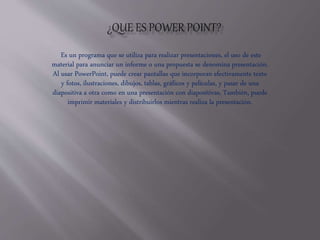 Este documento proporciona instrucciones sobre cómo usar diferentes funciones de Microsoft PowerPoint. Explica los componentes básicos de la interfaz como la cinta de opciones, área central y botones de vista. También describe cómo insertar y formatear elementos como tablas, formas y gráficos. Además, detalla cómo aplicar temas, transiciones y animaciones, y reproduce presentaciones de manera automática.