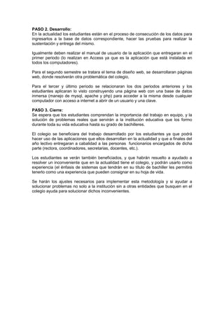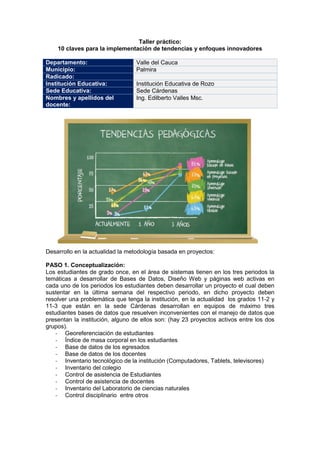 El documento describe un taller práctico sobre la implementación de enfoques innovadores en una institución educativa. Los estudiantes de grado 11 están desarrollando proyectos en bases de datos, diseño web y páginas web activas para resolver problemas de la institución. Actualmente hay 23 proyectos activos que abordan temas como la georreferenciación de estudiantes e inventarios. Se espera que los estudiantes aprendan el trabajo en equipo y puedan resolver problemas reales que beneficien a la institución.