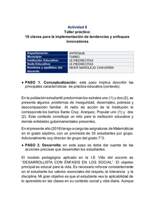 Este documento describe los pasos para implementar enfoques innovadores en una escuela en Turbo, Antioquia. El contexto de la escuela incluye estudiantes de estratos bajos con problemas de seguridad y desempleo. El modelo pedagógico se enfoca en desarrollar valores sociales y la aplicabilidad de lo aprendido. A pesar de los recursos limitados, el docente fomenta el trabajo en equipo y ejercicios prácticos. Conclusión: a pesar de las dificultades del contexto, es importante fortalecer la res