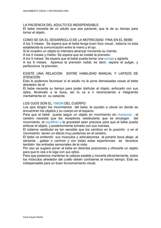 Este documento describe el desarrollo de la motricidad fina y el seguimiento visual en los bebés. Explica que la coordinación ojo-mano se va desarrollando gradualmente a medida que el bebé madura, y que es importante darles tiempo y estímulos apropiados para que puedan explorar objetos y mejorar estas habilidades. También recomienda realizar ejercicios de seguimiento visual con los bebés moviendo objetos en diferentes direcciones para apoyar el desarrollo de su motricidad fina y habilidad manual