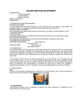 Este documento presenta un taller práctico de Internet que incluye preguntas y respuestas sobre temas como la diferencia entre navegadores, portales web y motores de búsqueda, así como ejemplos de cada uno. También incluye definiciones de términos relacionados con Internet y la especialidad de cada participante.