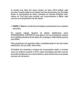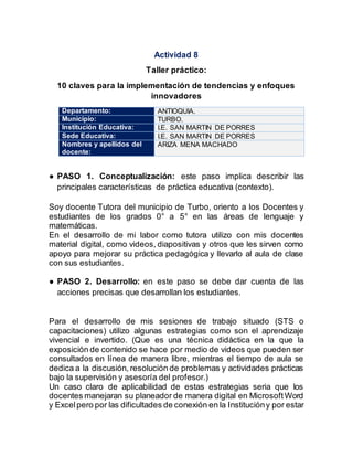 El documento describe las 10 claves para la implementación de enfoques innovadores en la educación. La autora es una tutora que trabaja con docentes y estudiantes de grados 0 a 5 en lenguaje y matemáticas. Ella utiliza material digital como videos y diapositivas para mejorar la práctica pedagógica de los docentes. También emplea estrategias como el aprendizaje vivencial e invertido durante las sesiones de capacitación. Aunque hay dificultades de conexión, los docentes aprovechan los fines de semana para ampliar conocimientos en