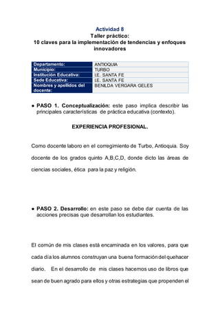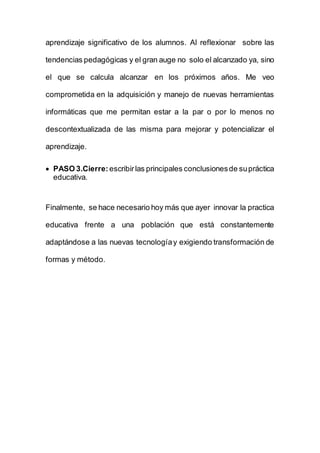 Este documento presenta los tres pasos para implementar tendencias y enfoques innovadores en la práctica educativa. El primer paso es conceptualizar el contexto y describir las características de la práctica actual. El segundo paso es desarrollar acciones precisas que permitan un aprendizaje significativo en los estudiantes a través de estrategias como libros y herramientas tecnológicas. El tercer paso es concluir resaltando la necesidad de innovar constantemente los métodos para adaptarse a los cambios tecnológicos requeridos