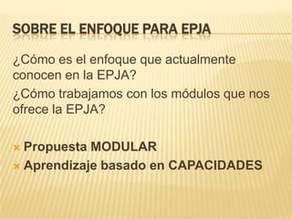 El taller propuesto por el Profesor Lic. Nieto Alejandro enfoca en la enseñanza de matemáticas en la educación de jóvenes y adultos (EPJA) a través de un aprendizaje basado en capacidades, utilizando situaciones problemáticas reales para resignificar el conocimiento. Se identifican problemáticas en la forma de enseñanza y se sugieren proyectos de acción, como abordar la desnutrición infantil, para desarrollar habilidades matemáticas en contextos sociales. El documento también destaca la importancia de que los educadores posean flexibilidad curricular y habilidades para trabajar comunicativamente con diversas instituciones sociales.
