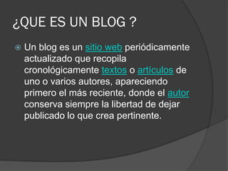 Un blog es un sitio web periódicamente actualizado que recopila artículos de uno o más autores de forma cronológica, con las publicaciones más recientes apareciendo primero. Los blogs son personales y permiten a los lectores comentar cada publicación. Un blog se crea completando un formulario con la dirección, nombre, tema, contraseña y nombre de usuario.
