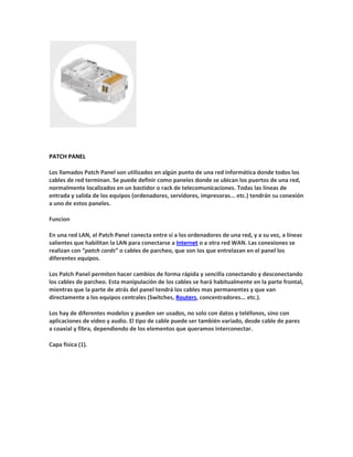 RJ-45 es una interfaz común usada para conectar redes de cableado estructurado que posee ocho pines. Los patch panels permiten hacer cambios rápidos en las conexiones de red mediante cables de parcheo. Los switches interconectan segmentos de red pasando datos según la dirección MAC.