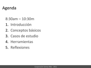Este documento presenta una agenda para un taller sobre redes. Incluye introducciones a conceptos básicos sobre cómo las nuevas tecnologías de comunicación están cambiando la forma en que las personas se agrupan y colaboran. Analiza casos de estudio exitosos como Colombia Soy Yo y Momsrising que lograron gran impacto a pesar de contar con pocos recursos iniciales gracias al uso efectivo de las redes. Finalmente, presenta algunas herramientas tecnológicas útiles para el trabajo en red como Google Forms, Livestream y Slideshare.