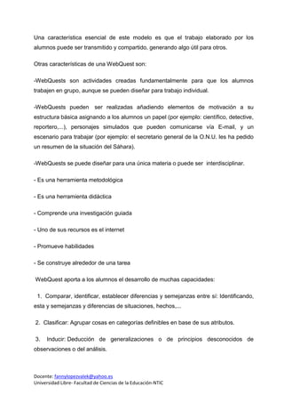 El documento habla sobre el uso del video educativo y las webquest como estrategias didácticas en ambientes virtuales de aprendizaje. Describe las principales características de cada uno, incluyendo que los videos pueden captar la atención de los estudiantes y facilitar el acceso a la información, mientras que las webquest permiten desarrollar habilidades a través de tareas guiadas de investigación. También discute ventajas y desventajas de ambas estrategias y cómo un profesor podría implementarlas en su propia enseñanza.